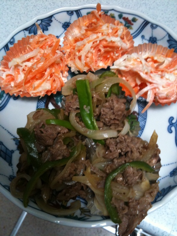 牛肉と玉ねぎとピーマンのお醤油とおソース炒め。