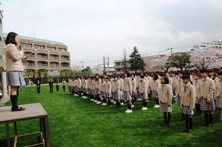 一番初めに行われたのは「新旧対面式」。新入生と在校生、全員がグラウンドで顔合わせをしました。