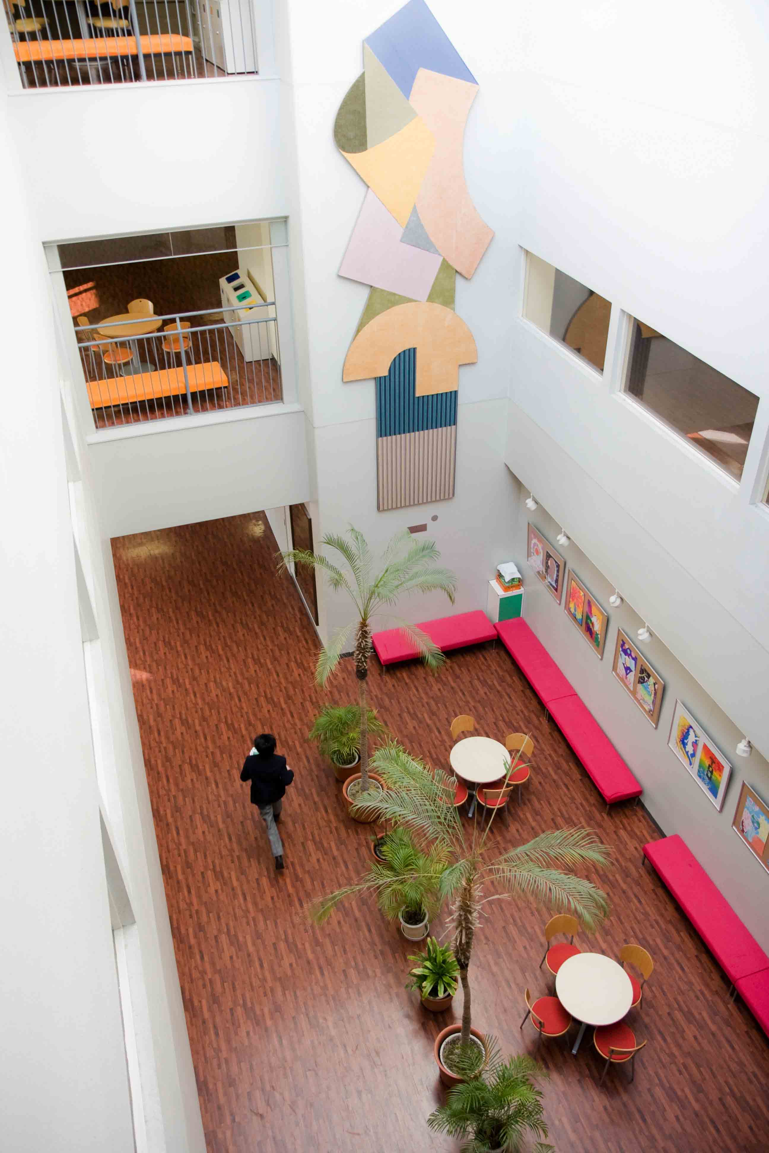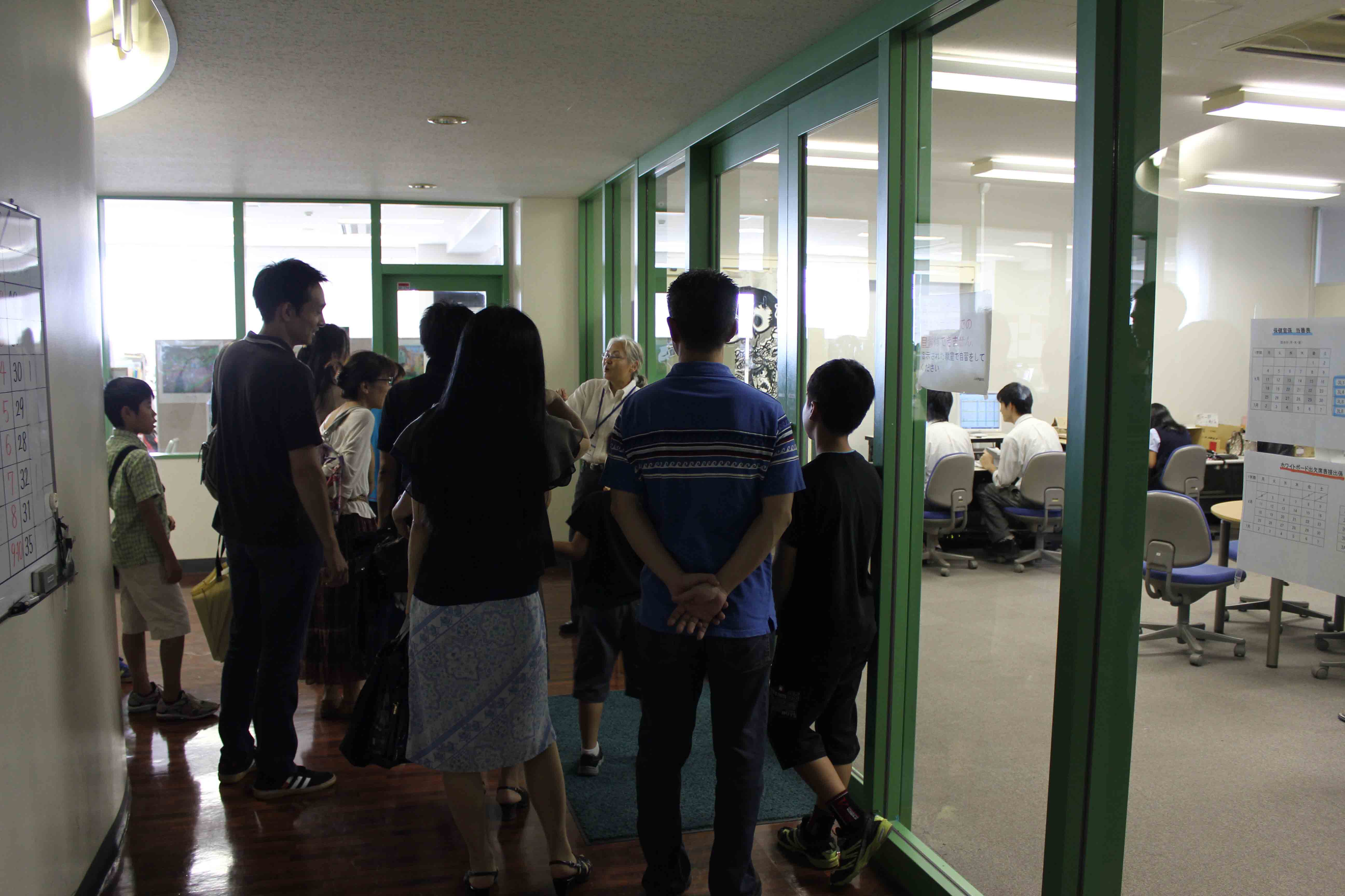 説明会終了後には希望者対象の校内見学があり、ほとんどの保護者・小学生が引き続き参加されていました。先生方に一つひとつの教室や施設を解説していただきながら、ガラス張りの近代的な学校施設を興味深く見てまわりました。