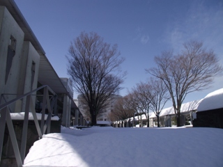 先週降った雪がキャンパスのいたる所に残っております。キャンパスが広いと雪が溶けるのに時間がかかります。大妻多摩は今でも雪の中です