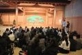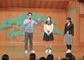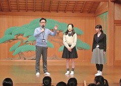 新作狂言「鮎」は中3生にも、とてもよく理解ができる作品で、鮎の動く姿や人間の味わいある姿に笑い声が能楽堂に響いていました。藤田氏の笛の音には身の引き締まる思いがしました。万作先生の姿にはただただ圧倒されました。「『能楽』は敷居が高い」と思うことは今年の様々な能楽体験で、なくなったのではないかと感じます。