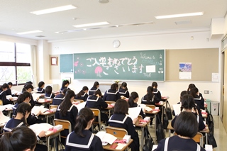 入学式後、新1年生はガイダンスを2日間に渡り受けます。廊下を歩きながらふと中学1年生の教室をのぞくと、毎年、緊張しつつも期待に胸ふくらむ顔が行儀良く並んでいます。真新しいセーラー服の白い3本線が輝いて見えます。この風景こそが、大妻多摩の春景色です。キャンパスのあちらこちらで、新しい友達と昼休みにお弁当を持ち出して、美しい桜の下で昼食を楽しむ生徒達の姿が見かけられます。小さいときによく聞いた、「1年生になったら~」という歌を思い出します。新6年生の皆さん、来年、こんな景色の中にいる自分の姿を想像してみてください。
