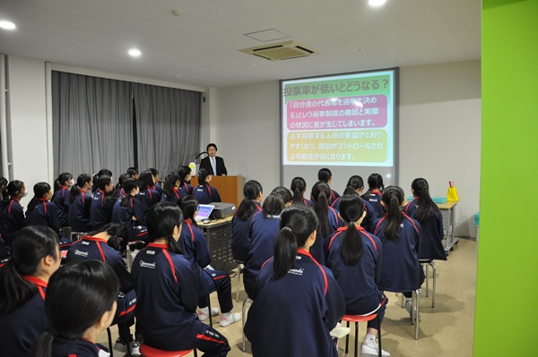 高校1年生は16歳になる年です。つまり、2年後には選挙権を持つことになります。その前に、「選挙」を体験し、社会の中の1人として責任を持った行動をとれるようになって欲しいと考え、実施しています。
