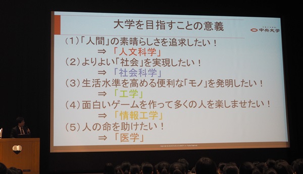 講演では、私たちの出てゆく現代社会がどのように変化し、大学での学びがどのように反映されていくのか、更に、各学部での学びの特色について、具体的な講義内容を紹介しつつ分かりやすく説明していただきました。法学部の説明の際には演劇部員の熱演を受け、皆判例について真剣に考えていました。
