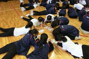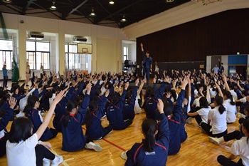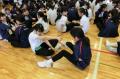 始めはペアワークから始まり、徐々にクラスを横断したチームを作り「心と体と頭」を使ったワークを実施しました。始めは何をするのかわからず、不安と期待の気持ちが入り混じっている様子でしたが、時間が経つにつれ、考えるよりも感じたことをすぐに表現できるようになり、クラスを越えて多くの生徒と交流することができました。