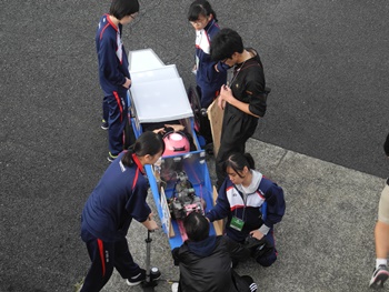 本校チームは8人編成、もちろん全員女子のチームです。中3の時、科学研究チャレンジプログラムでロボット班にいた仲間が、指導教員の呼びかけに応えて高1で出場することになりました。