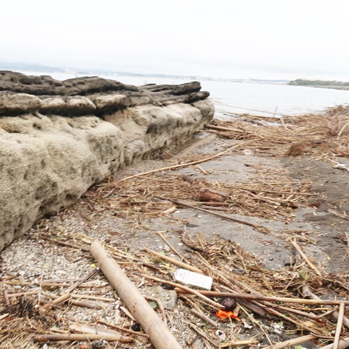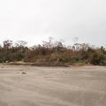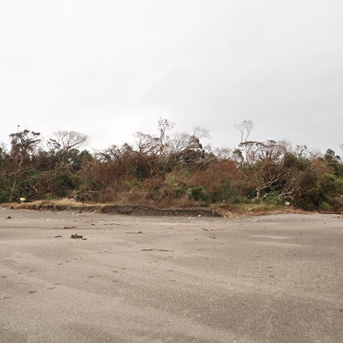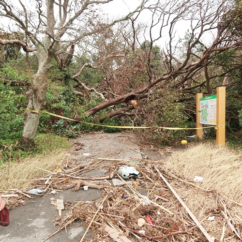 台風15号で倒れた木が森の入り口をふさいでいます。うっそうとした森でしたが、今では空が見えています。また、台風19号の高波で、ここまで漂流物が運ばれてきていました。