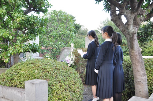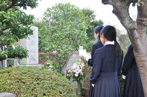 毎年この日は、授業開始前の全校朝礼から始まり、放課後には生徒会役員が生徒代表として、青山墓地にあるお墓まで、墓参に行っています。