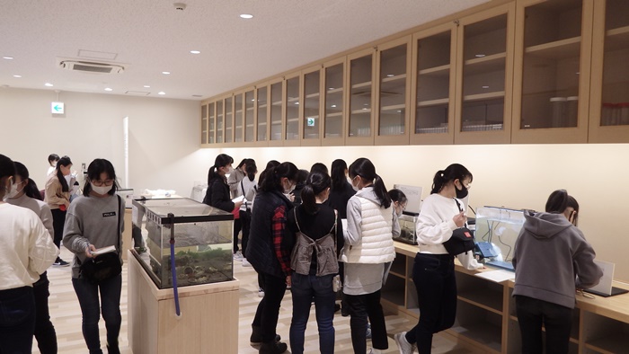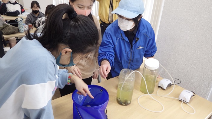 「干潟観察&浄化実験グループ」はスコップで砂を掘り、埋まっている二枚貝を採集し、その二枚貝で浄化実験を行いました。浄化実験は2つの水槽に汚れを入れ、片方だけ二枚貝を入れて行いました。二枚貝の入っている水槽が浄化されていくのを見て、干潟の生物の大切さを感じることができました。