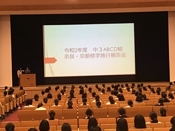 ・修学旅行では改めて、京都奈良の文化や仲間の大切さ、協力することの大切さを学びました。また、校外学習の報告会を聞いて、去年までは、全クラス同じところで、同じ活動をしていたけれど、今年はクラスによって、行く場所が違っていましたが、どのクラスの校外学習もとても楽しそうだなと思いました。また、英語チャレンジプログラムの発表を聞いて、発表する人が英語で話していたあとに日本語で説明していて、英チャレならではの発表だと思いました。