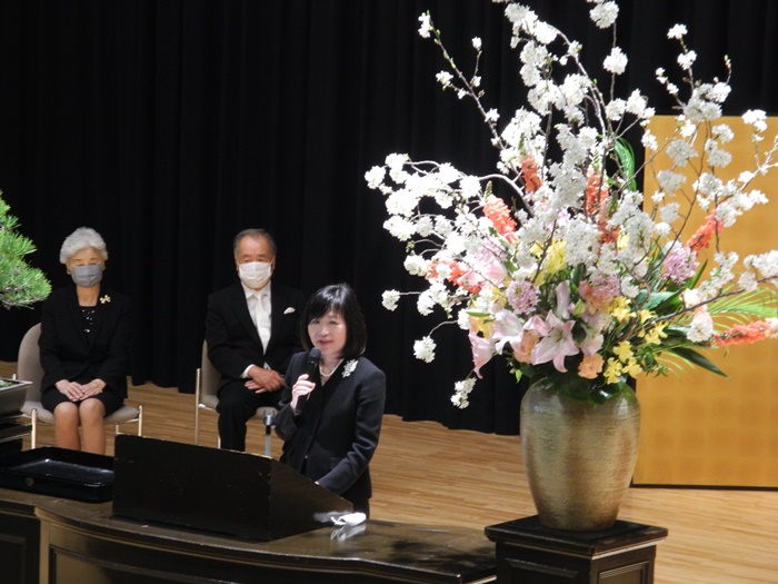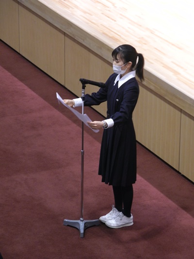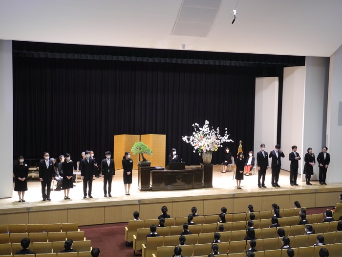 生徒は講堂で1席ずつ空けて座り、保護者は教室から中継映像を視聴する形で挙行しました。