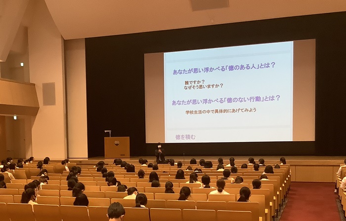 本校の建学の精神、校歌、初代校長山脇房子先生のお言葉を手掛かりにしながら道徳とは、徳のある人物とはどのようなことなのかを学んでいきました。