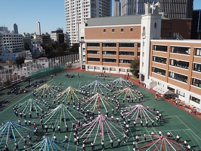 ミニ体育祭の幕開けは、中3「メイポール」。最高の団結力と笑顔で、感謝の気持ちを込めて踊り、素敵な幕開けとなりました!