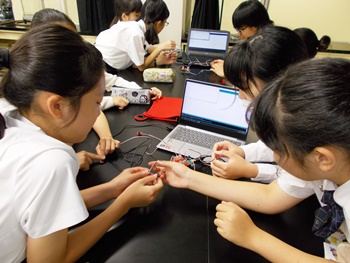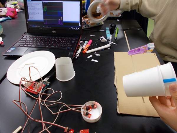 中学1年~3年の希望者34名が参加し、2名のTAの方々にサポートをして頂きながら、持参した不用品の他、身のまわりの様々な物に光センサを取り付けたオリジナル楽器作りにチャレンジしました。