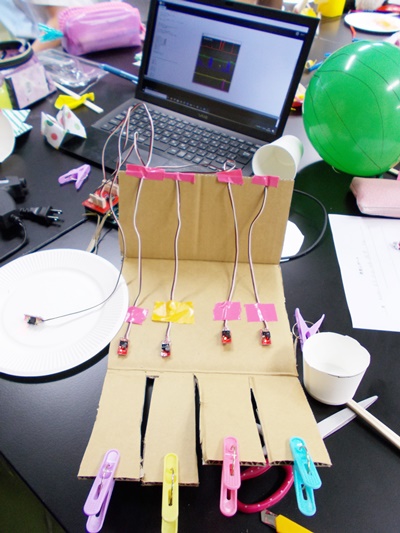 さらに、Processingという電子アートとビジュアルデザインのためのプログラミングを加えることで、光センサで測定した距離によってサウンドが出る楽器ができます。1人1音もしくは2音を分担し、それぞれのアイデアで音の出し方が異なる楽器を作っていきました。